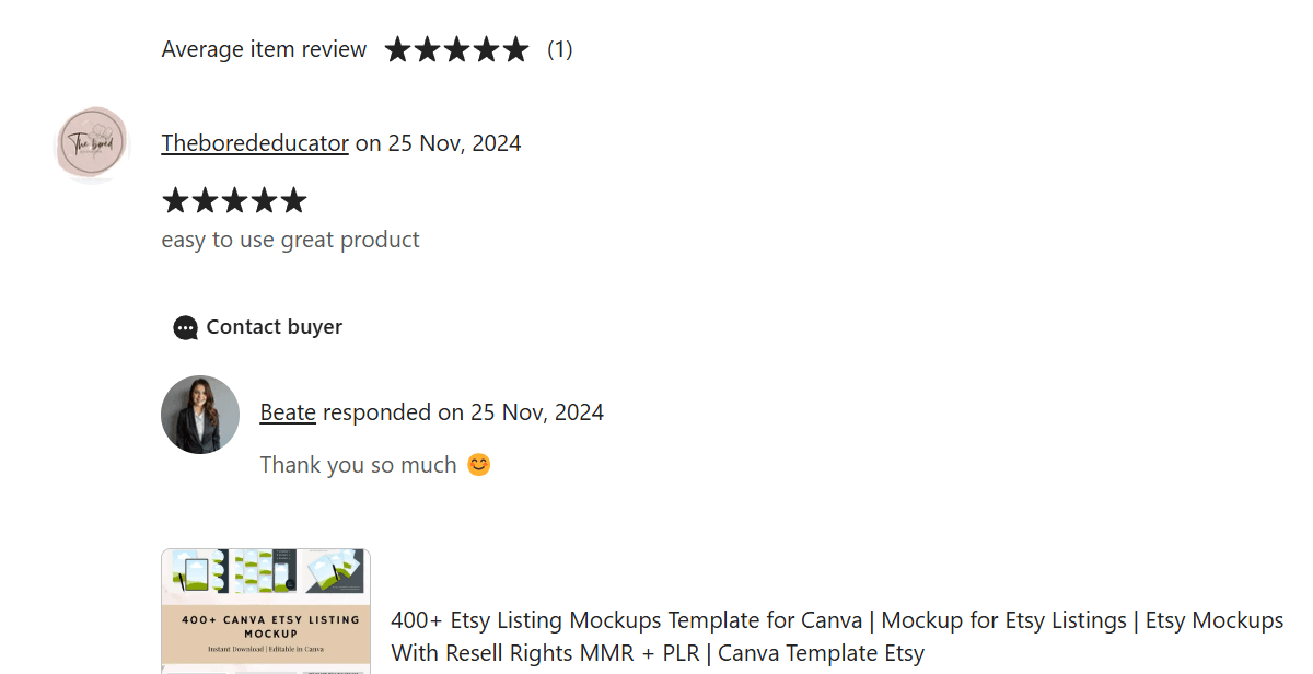 She bought the 444+ Etsy Listing Mockups and left a ⭐⭐⭐⭐⭐ review: “Easy to use, great product.” These templates gave her the clarity to stop circling the same challenges and actually move forward with her shop.